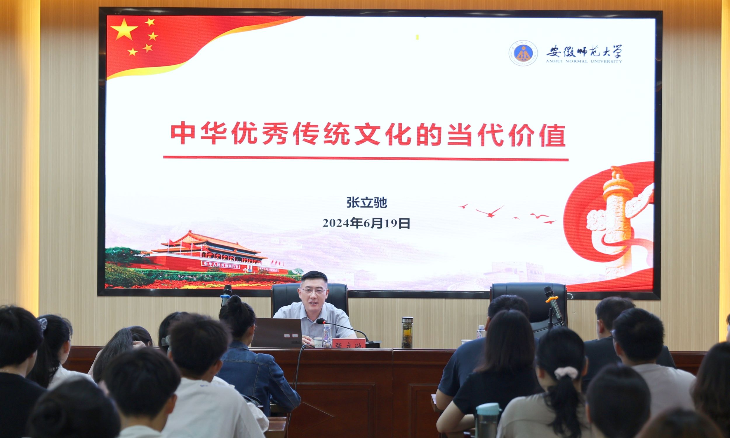 6月19日下午,为深入学习贯彻习近平总书记对学校思政课建设作出的重要指示精神,落实立德树人根本任务,贯彻“两个结合”的根本要求,校党委书记张立驰以《中华优秀传统文化的当代价值》为主题,为马克思主义学院、数学与统计学院师生讲授了一堂生动的思政课。