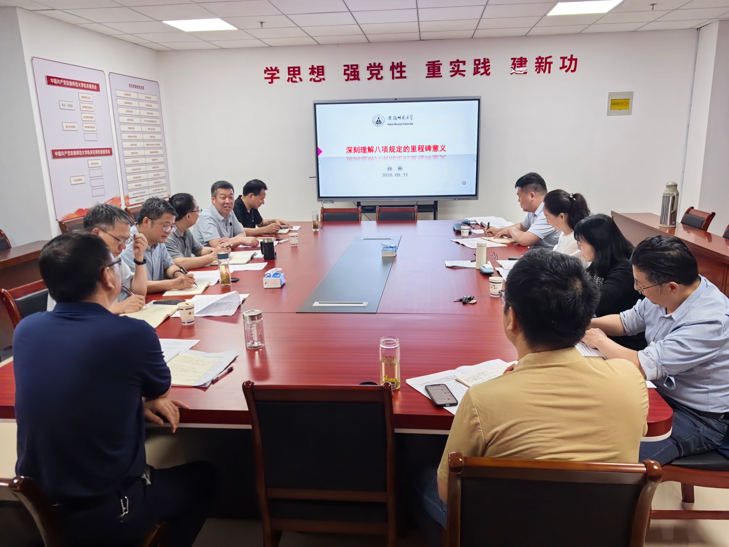 5月21日下午,机关党委召开深入贯彻中央八项规定精神学习教育专题辅导报告暨理论学习中心组(扩大)学习会,科研处处长、科研处党支部书记徐彬教授应邀作专题辅导,机关党委委员、纪委委员、部分党支部书记参加会议,会议由机关党委书记汪俊武主持。